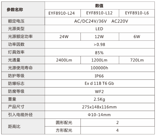 - 采用國際知名品牌光源,兩種配光方案選擇,滿足不同場所配光需求;圓形配光的配置適合井下工作面等場所大范圍照明需要,方形配光配置適臺在各種隧道中長距離照明需要;