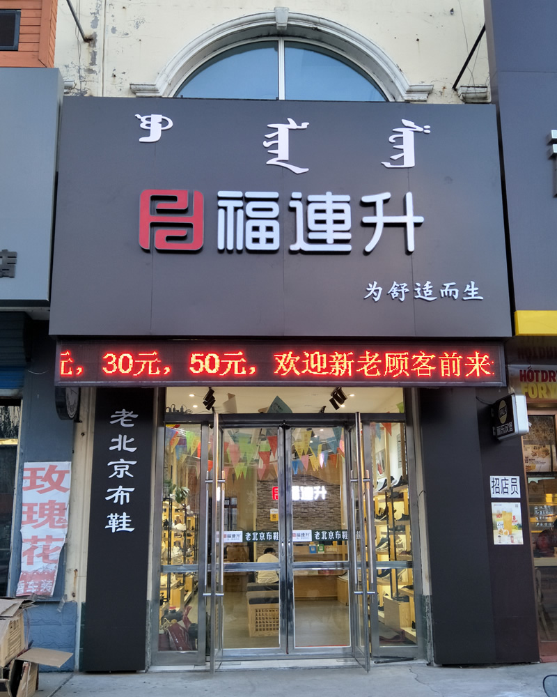 在此,福連升健康休閑中年鞋(原福連升(原福聯(lián)升)老北京布鞋)全體員工祝賀:福連升中年鞋內(nèi)蒙通遼市科爾沁左翼中旗寶龍山鎮(zhèn)二店開業(yè)大吉、生意紅火、財(cái)源廣進(jìn)!誠邀各地有志之士加盟合作,共享輝煌!